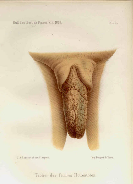 Elongated labia (also known as Sinus pudoris or macronympha and albeit nonmedically, as khoikhoi apron or hottentot apron), are a feature of certain Khoikhoi people, whose female members develop relatively elongated labia minora, hanging up to four inches outside their vulva when they are standing in an upright position. The "apron" designation was apparently gained from the tendency of early European descriptions to misidentify the pair of labia as a single, wide organ, which they called, in French, a tablier, or "apron"